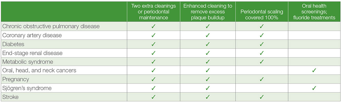 We’re able to review the medical claims of members with Asuris health plans to identify and automatically enroll those with one or more eligible medical conditions (listed below)—this is something stand-alone dental carriers cannot do.